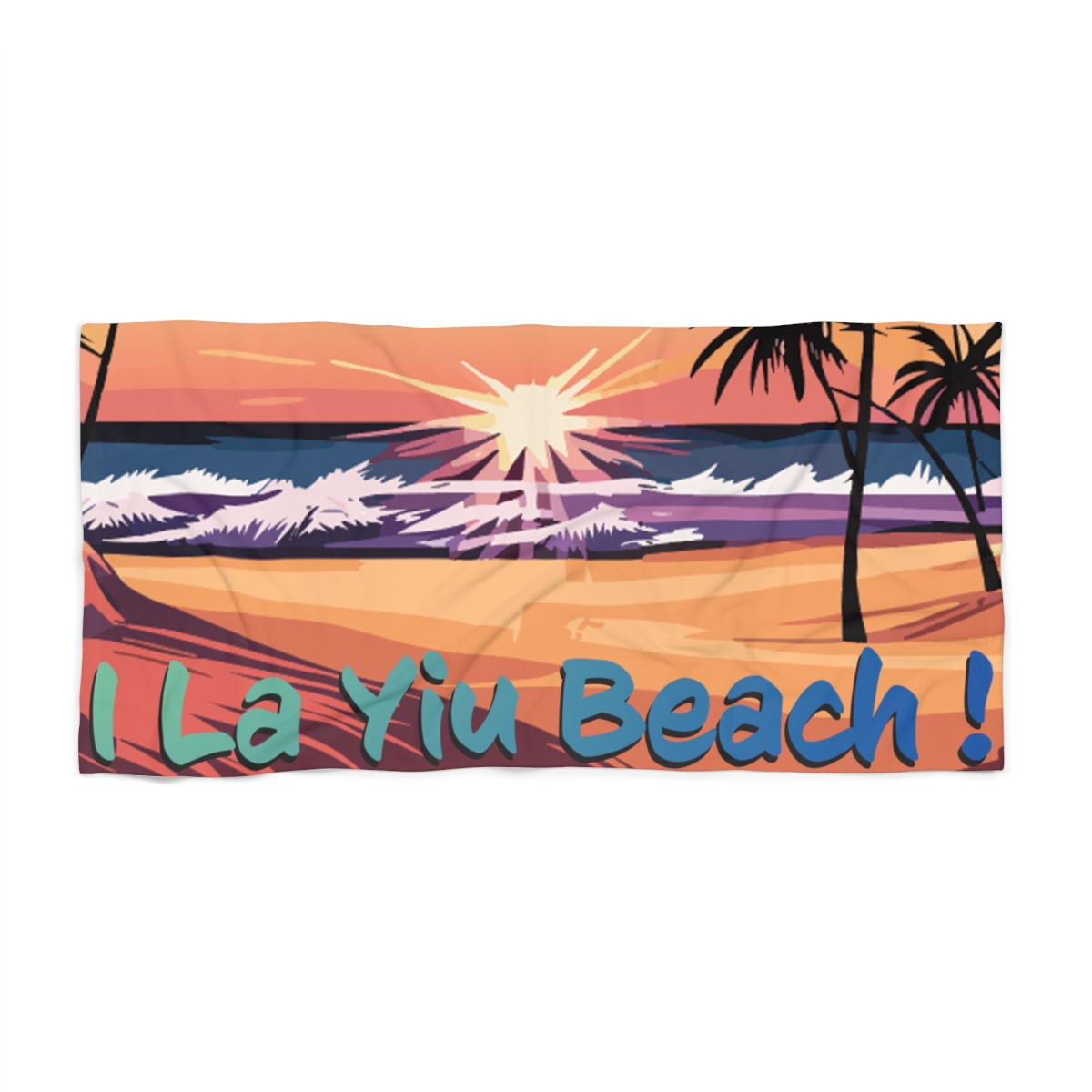 Elevate your beach experience with our “I La Yiu Beach Sunset” towel, a harmonious blend of functionality and coastal charm. This exquisite towel showcases a picturesque paint drawing of a sunset, with waves gently kissing the sandy shore and palm trees swaying in the background. And to add a touch of whimsy to your seaside moments, the towel proudly declares, “I La Yiu Beach.”