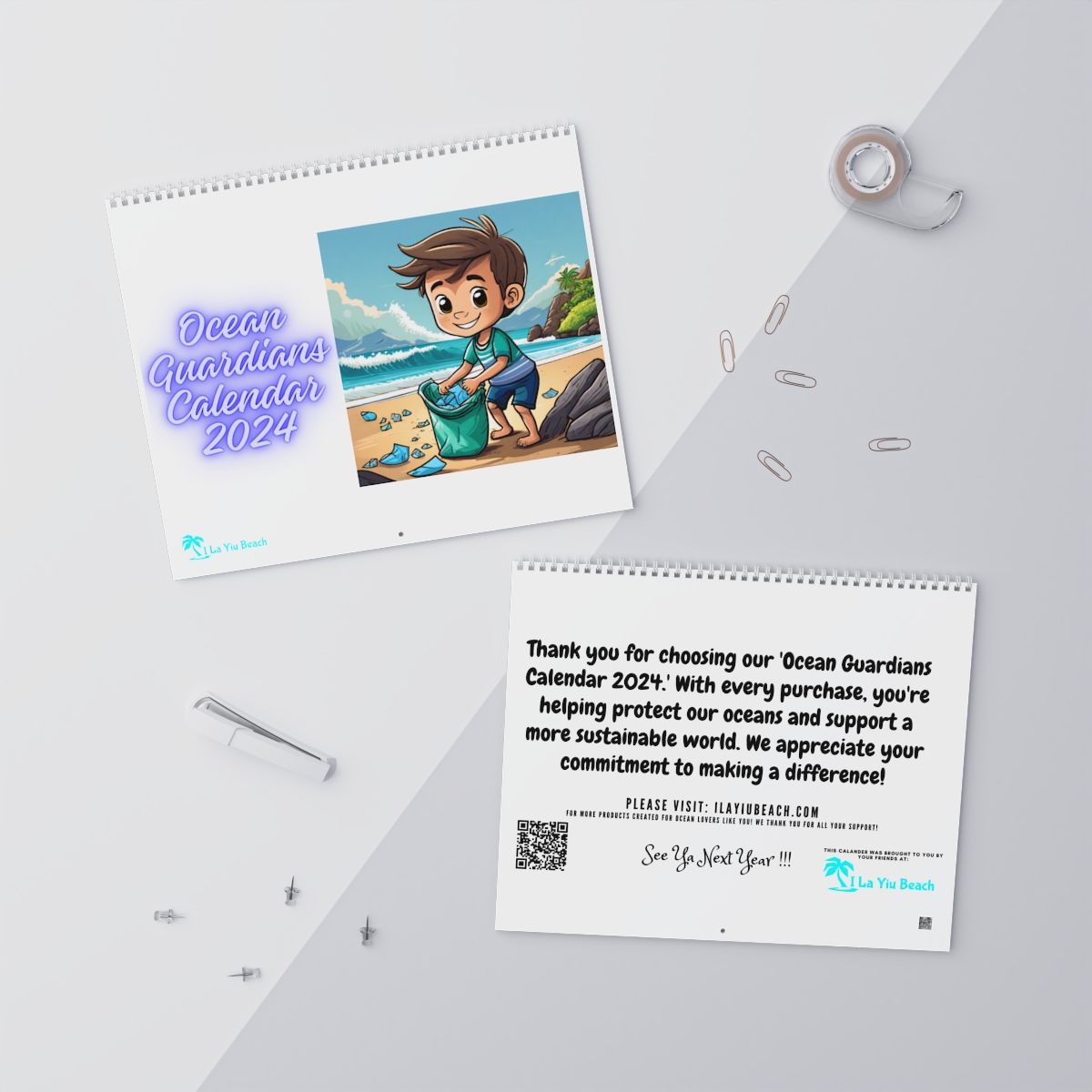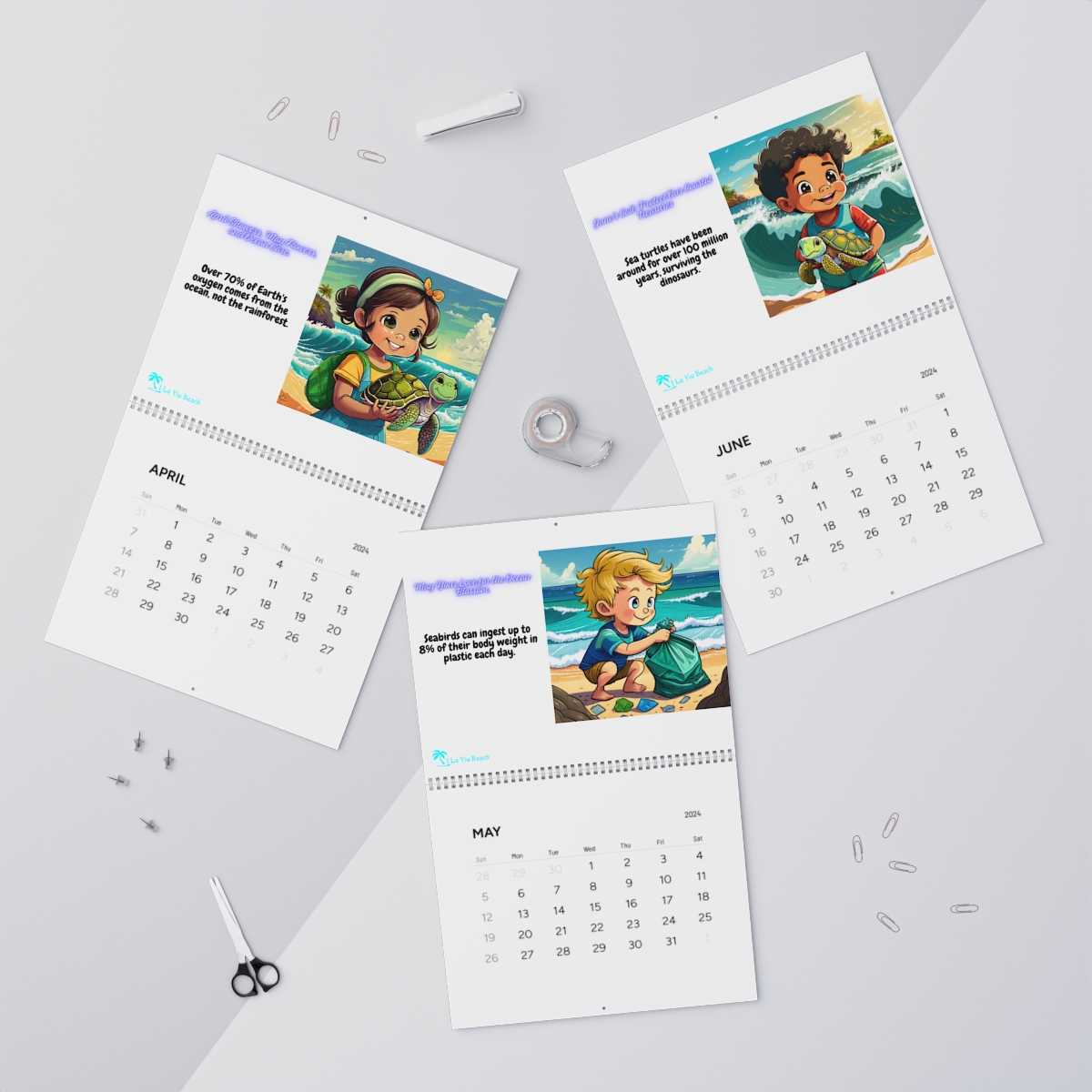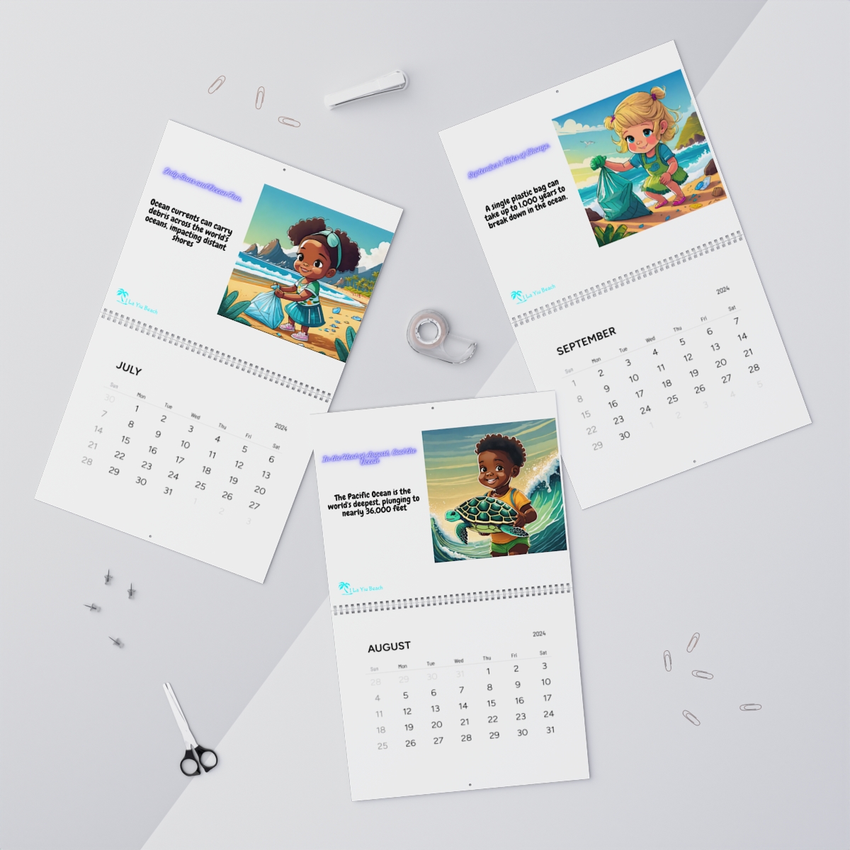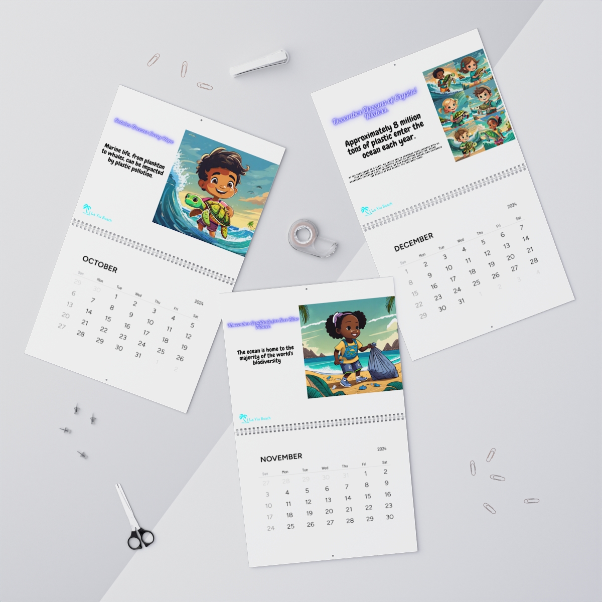 Introducing the “Ocean Guardians Calendar 2024,” a year-long journey through breathtaking art and meaningful messages. Each month features unique artwork of diverse babies taking action against ocean pollution, set against stunning beach backdrops. Join these little heroes on their mission to protect our precious oceans.